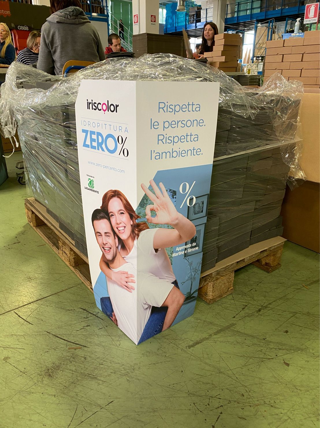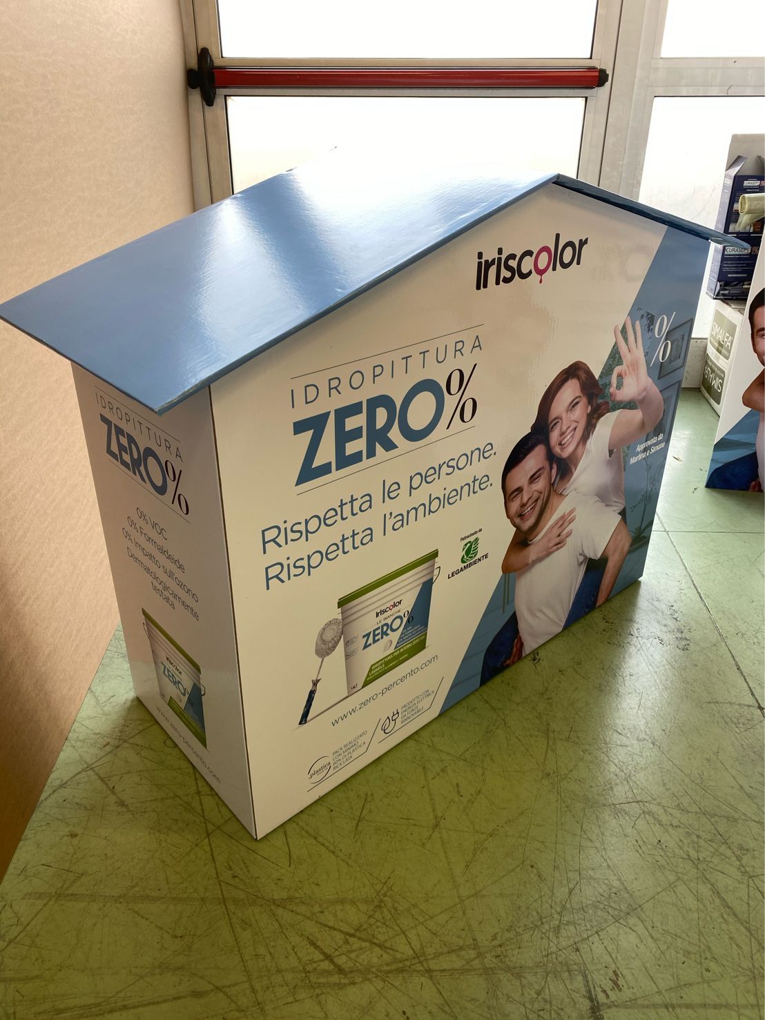 Esposizione in Cartone Riciclato FSC per Lancio Promozionale Completo di Totem, Casetta Sospesa in Cartone, Porta Volantini didattici, Volantini e Angolari Pallet Promozione Stampati.