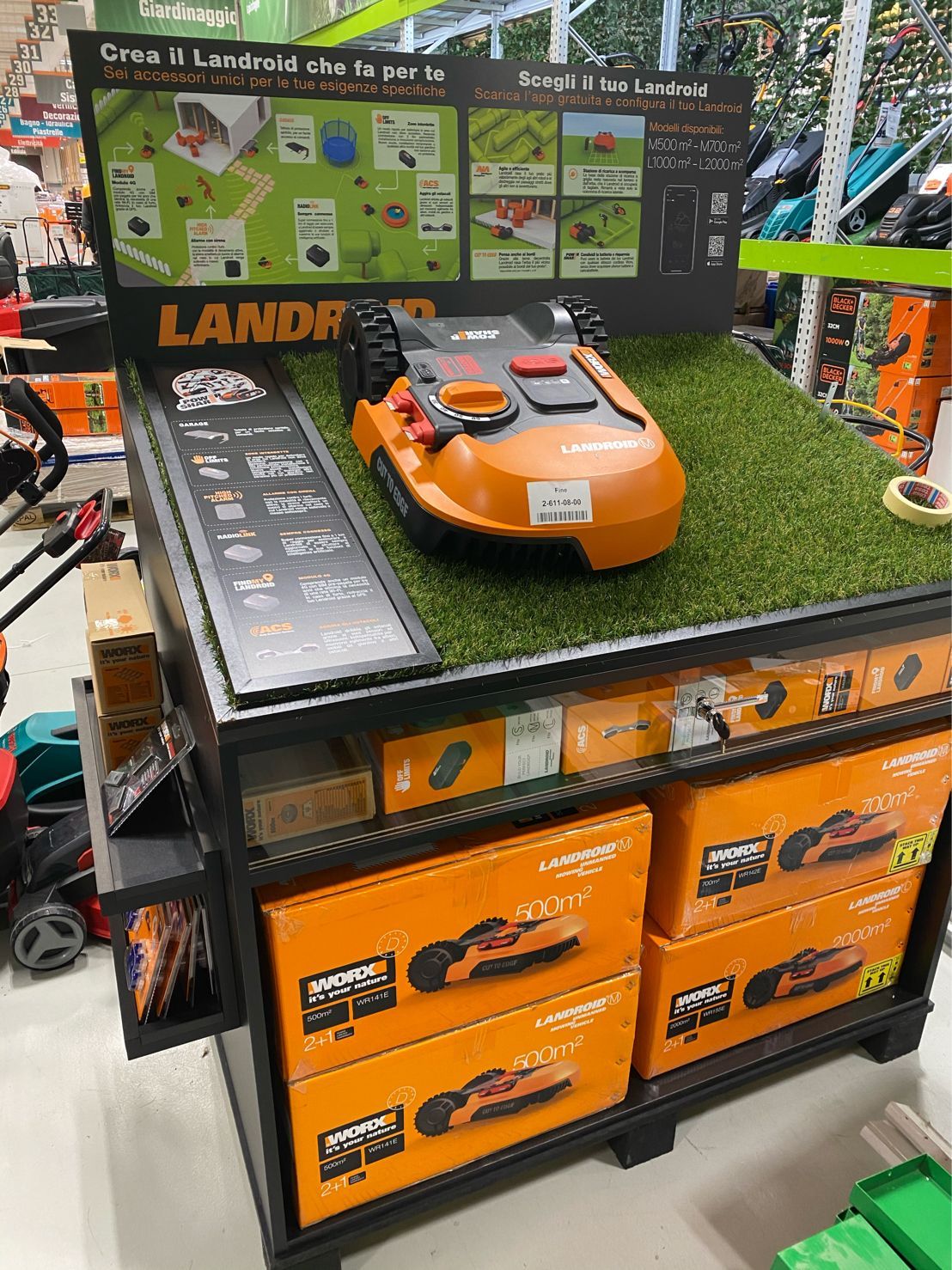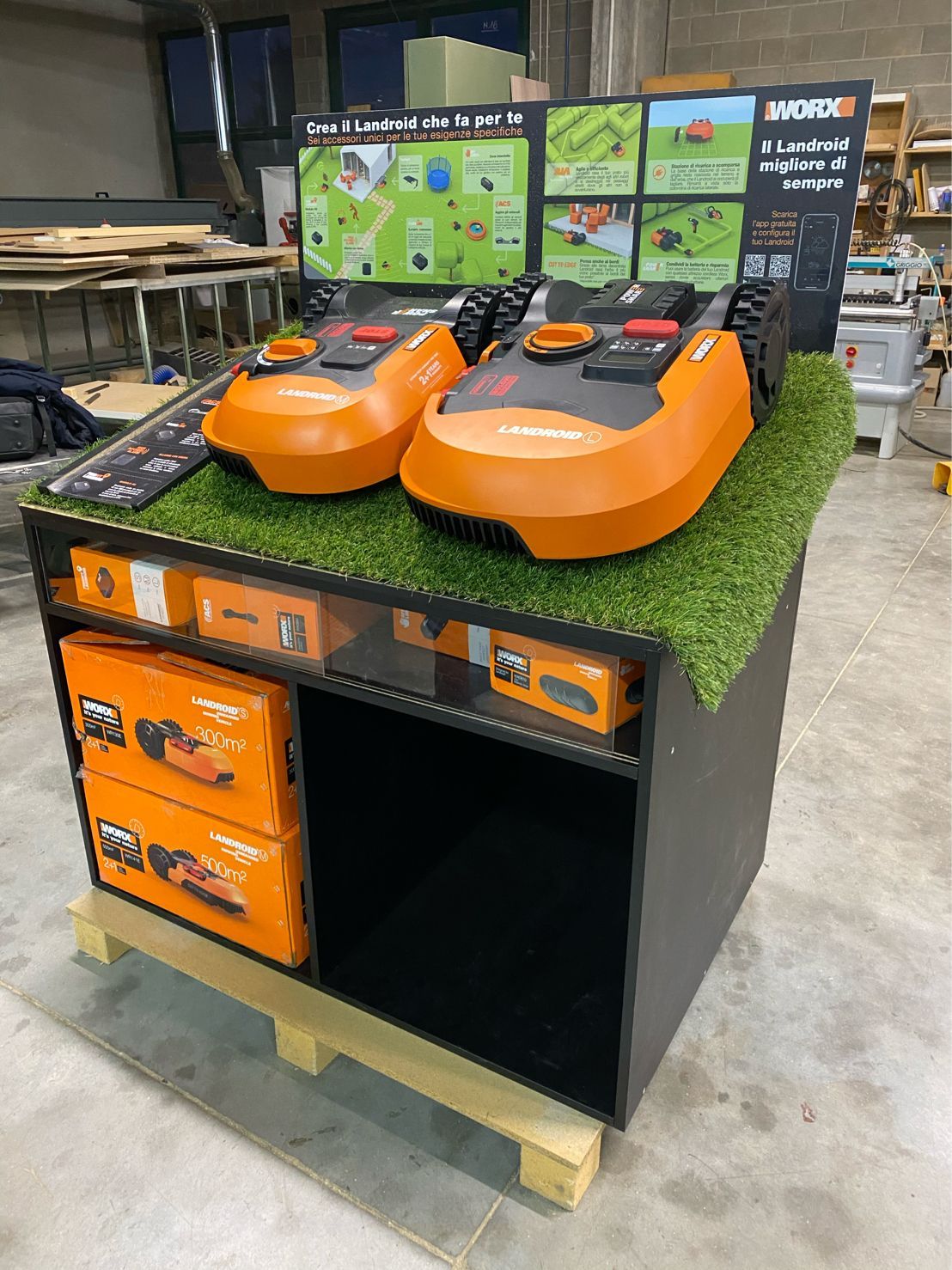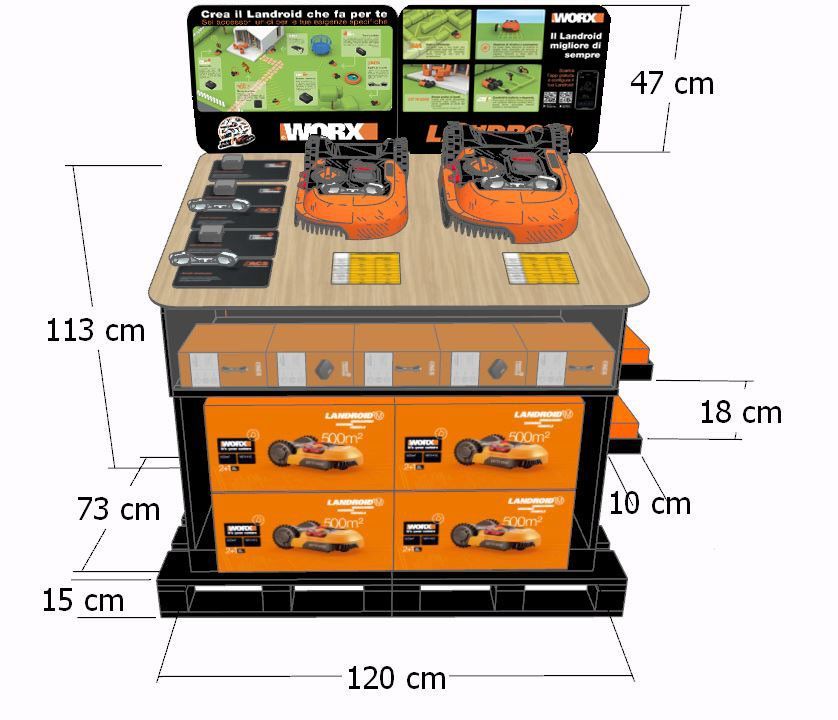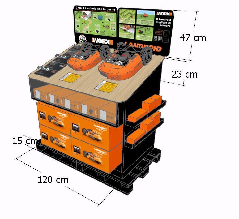 Espositore da Terra in MDF Riciclato e Verniciato da uno spazio Pallet, completo di Teca con serratura e vetrine in plexiglas. Ripiano per Esposizione campioni e vano alloggiamento prodotti.