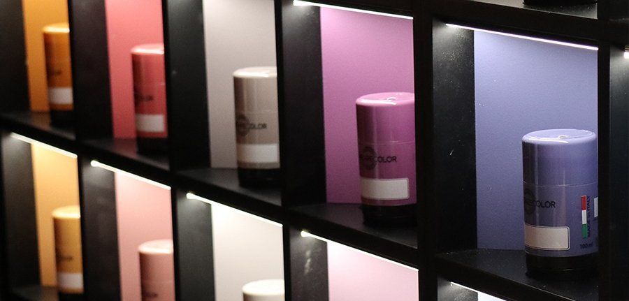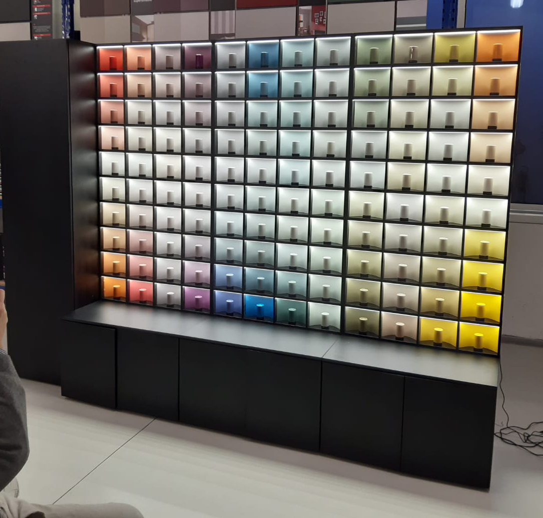 Struttura Espositore per assortimento gamma colori vernici realizzato in esclusiva per Covema. Dotato di mobile laterale e cassetti porta Tacche colore. Esposizione illuminata a Led.